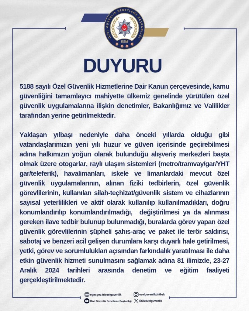 Yaklaşan yılbaşı nedeniyle daha önceki yıllarda olduğu gibi vatandaşlarımızın yeni yılı huzur ve güven içerisinde geçirebilmesi adına halkımızın yoğun olarak bulunduğu alışveriş merkezleri başta olmak üzere otogarlar, raylı ulaşım sistemleri (metro/tramvay/gar/YHT gar/teleferik), havalimanları, iskele ve limanlardaki mevcut özel güvenlik uygulamalarının, alınan fiziki tedbirlerin, özel güvenlik görevlilerinin, kullanılan silah-teçhizat/güvenlik sistem ve cihazlarının sayısal yeterlilikleri ve aktif olarak kullanılıp kullanılmadıkları, doğru konumlandırılıp konumlandırılmadığı, değiştirilmesi ya da alınması gereken ilave tedbir bulunup bulunmadığı, buralarda görev yapan özel güvenlik görevlilerinin şüpheli şahıs-araç ve paket ile terör saldırısı, sabotaj ve benzeri acil gelişen durumlara karşı duyarlı hale getirilmesi, yetki, görev ve sorumluluklar açısından farkındalık yaratılması ile daha etkin güvenlik hizmeti sunulmasını sağlamak adına 81 ilimizde, 23-27 Aralık 2024 tarihleri arasında denetim ve eğitim faaliyeti gerçekleştirilmektedir” denildi.